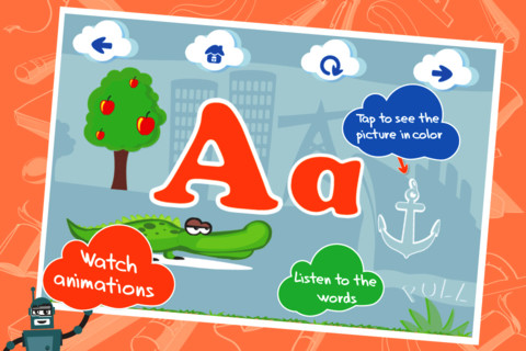 This ABC app for the iPhone/iPad is FREE for a limited time. It is designed to teach 2 – 5 year olds the letters of the alphabet and their sounds. Kids may explore the alphabet in any order that they wish. There are over 100 animations which correspond to the letters of the alphabet. The 3 words for each letter are pronounced and spelled. The illustrations are animated cartoons. Pages for each letter are uncluttered – simply presented but engaging. The app also has a parent section that shows how often your child has visited each letter. Nicely done!