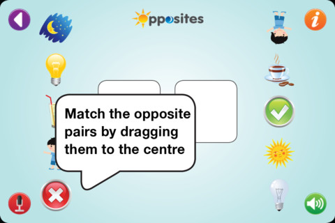 This app for the iPhone/iPad is designed for kids ages 2.5+ to help develop the concept of opposites. Two levels are unlocked in the FREE version with 10 additional levels available if you purchase the full version. Each level has 4 sets of opposites to match. Kids find 2 pictures that show opposites and drag them into the box. As they do so, the written word appears underneath. If correctly matched, they disappear making the each choice simpler. You can add your own voice (or even better, your child’s voice) reading the words. This option is important for younger kids who cannot read the words plus it helps them make the text-to-print connection. Before adding sound however you’ll need to make sure you know what word will appear under the picture because that information in not on the recording page. I had trouble recording 4 out of the 16 words in the first 2 levels. The app would freeze and have to be restarted. I think young children would really enjoy hearing themselves “read” the words to go with the pictures so I am hoping that the developer can fix the bugs.