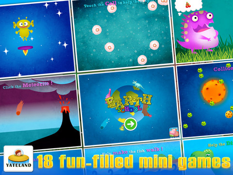 The app builds vocabulary (volcano, collision, fossils, cells). Kids follow directions to complete the games: Help make the fish walk; Touch cells to help them split; Move the cloud; Touch all the eggs; Feed the dinosaur; etc. The animations & artwork in the games are appealing. The bottom line is that YOU need to decide if this app is appropriate for YOUR children as it deals with evolution vs creation.