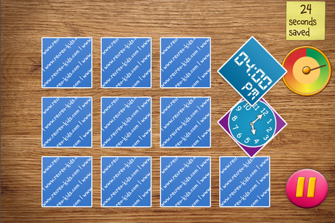 This app for the iPhone/iPad gives kids practice matching times on an analog clock with times on a digital clock in a “memory style” card game with a pirate theme. Clocks can be set as 12-hour clocks or 24-hour clock. Kids can take their time and choose the practice mode or get 30 seconds to match the cards in the “defeat the captain” mode. When the cards are matched successfully, the pirate cries – which I grew tired of very quickly but kids may think is funny. I played several games and the difficulty of the game did not seem to increase as I advanced – very basic, no time to the exact minute. Within the game there were also several cards with pictures only to match. All in all, this app seems more like a matching game than a telling time game.
