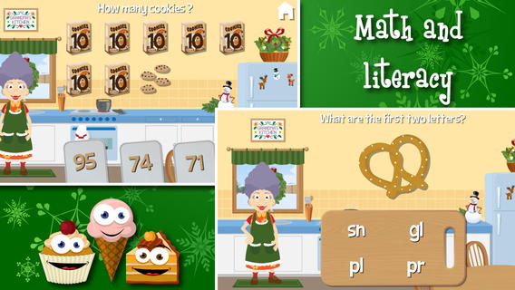 FREE for a limited time – Grandma’s Kitchen, an adorable educational app for preschoolers. Kids join dancing grandma in her kitchen which has just been decorated for the holidays. The app features 8 educational games – all thematically linked. Kids will love helping grandma around the kitchen and they will be learning math & reading as they help. The app also features short videos of real kitchen tools in action. The following concepts are integrated into the games: consonant blends, telling time to the hour, colors, vocabulary, healthy eating choices, compound words, numeral recognition/counting, addition, identifying equal parts of a whole, pattern recognition, and more!