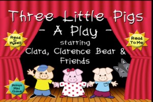 FREE again – Three Little Pigs – A Play for the iPhone/iPad for kids 4+. An updated version of the 3 Little Pigs is presented as a play starring Mitch, Clara, Ran, and Clarence Bear. The book is brightly illustrated and the characters respond when they are tapped. The background music and narration are nicely done. The book can also be read alone. The story generally follows the traditional tale – the first pig builds a house from straw, the second pig builds a house of sticks, and the third pig builds a house of bricks. All of the pigs get away (rather than the first 2 being eaten) and wolf runs away yelping in pain. The first 2 pigs learn the lesson: Take your time and do your best. The story ends with the first 2 pigs starting to rebuild their houses in the spring – this time with bricks, of course!