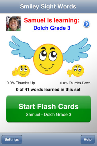 The app is very simple to use. First enter the students’ names and pictures. In the settings you can enter up to 40 students – perfect for a classroom teacher or an intervention specialist! Next you choose a list of words for each child to work on. There are 40 sets of Smiley Words (the 1000 most frequently used words), 18 sets of Dolch words, 10 sets of Fry words, 10 sets of UK words, 12 sets of AU color-coded words, plus 11 additional sets (upper case letters, lower case letters, number words, color words, etc.). There is also the option of making customized lists by mixing and matching words from other lists within the app. The app is ready to use! It displays one flashcard at a time. Tap the word to hear an American-English pronunciation. Then rate the ability to read the word with a thumbs up or a thumbs down. To be proficient, 3 thumbs up need to be collected for each word! The app generates a progress report at the end of the session which can be saved to photos. Once saved, it can be printed or emailed. The progress report is stated positively – Thumbs up % Pretty slick! This app makes it easy for teachers to provide individualized practice and keep track of their students’ progress. 🙂