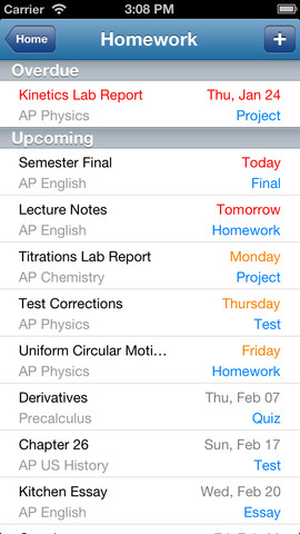 To set up the app, first edit the subject list & category lists to reflect what you are studying. After that, it is very easy to add assignments to the calendar – just give the assignment a title, choose the subject & category, put in the due date, choose a level of priority, and save. As you finish an assignment, mark it as complete and the app moves it to the finished list. App badges show you how many assignments you have and how many you have finished. Notifications can be set (1 or 2 days before) to remind you of an upcoming assignment. The app also keeps track of overdue assignments. Very slick and intuitive – great for teaching kids to be organized!!