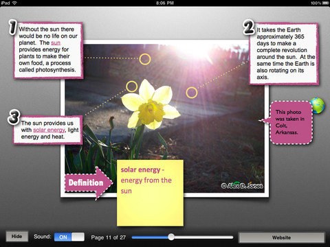 FREE for the iPad for a limited time, this science e-book is designed for 8 – 11 year olds & science teachers. Each page features a photograph that relates to earth science. The page also includes three scientific details about the photograph in both written and audio form – great for different styles of learners. Pertinent definitions are also included on many pages. The photos are arranged in groups – all the water photos are together, rocks & soil photos are together, etc. There are 20+ photos in this book and lots of great information but I wish there was an index to make it easier to retrieve it.